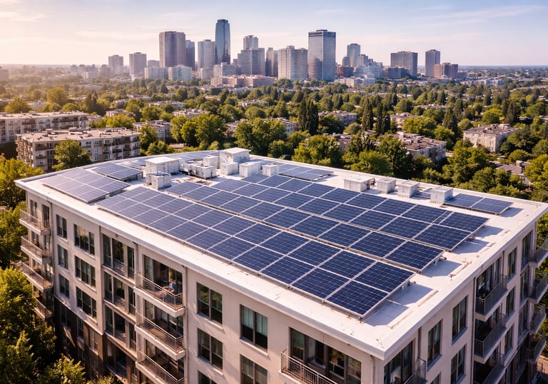 Plantas fotovoltaicas para áreas comunes de edificios y condominios, enfocadas en reducir gastos comunes y mejorar la eficiencia energética de la comunidad.