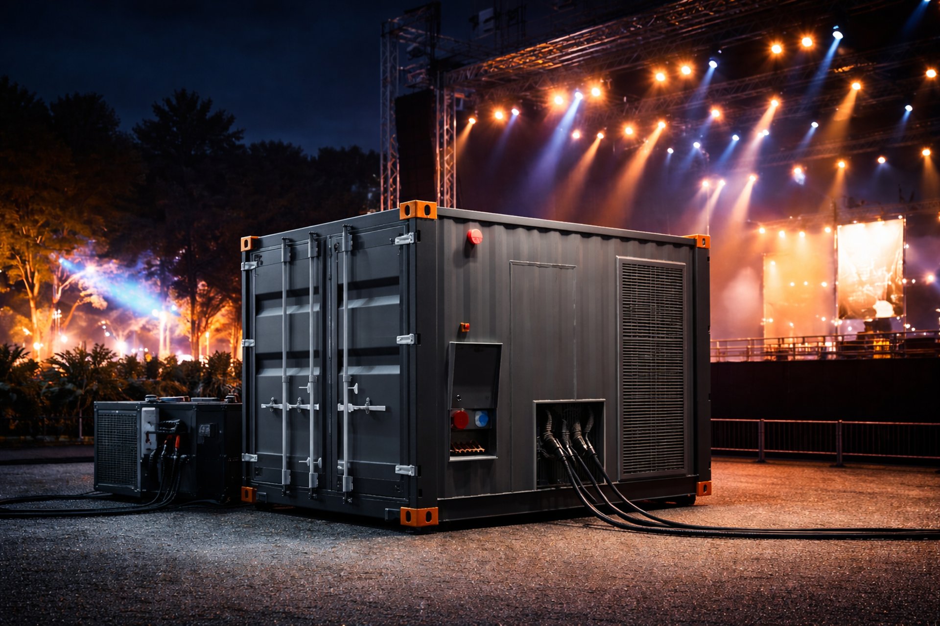 Alimentación de sistemas de sonido, iluminación, pantallas LED y estructuras auxiliares, sin ruido ni combustión en terreno.